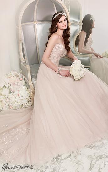 看惯了一线的婚纱秀场,难免会有些眼花缭乱,不知道哪一款才能把自己打造成为一位清纯迷人的新娘。Essense 2015婚纱中有这样一款腮粉色的婚纱,粉色一向是少女的专属颜色,身披这款婚纱出嫁,肯定是婚礼上最清纯的俏新娘。这款婚纱上精巧的珠片装饰让淡淡的腮粉色薄纱间隐隐的透出光芒,与婚纱搭配的钻石头饰与手环,让新娘的高贵气质更加凸显。