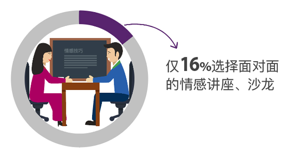 仅 16%左右的单身男女会选择参加面对面的情感技巧讲座、沙龙等去实践。
