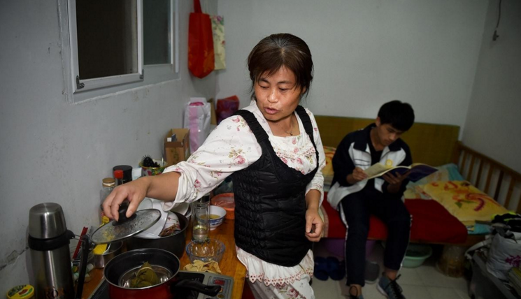 6月3日晚,陪读妈妈张大琴(左)给自己读高二、刚下自习的儿子赵嘉奇准备夜宵。