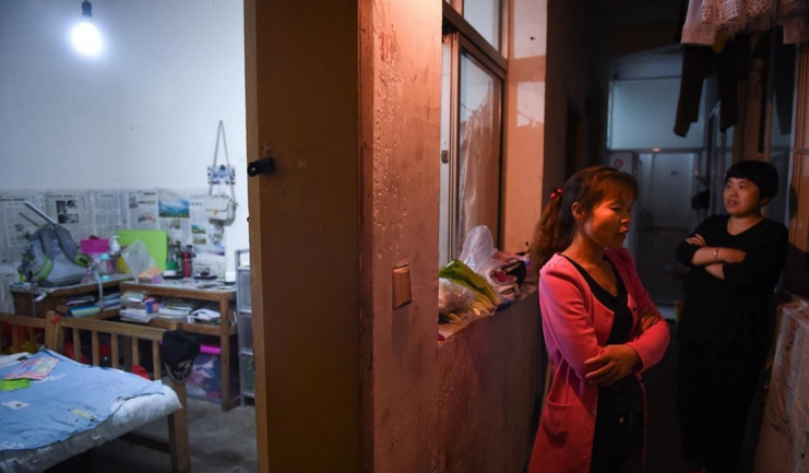 6月3日晚,陪读妈妈李升林(左)和王国年在出租房内聊天。晚间,毛坦厂中学的孩子们都要在校自习至11点左右,出租房里的妈妈们靠聊天打发时光。