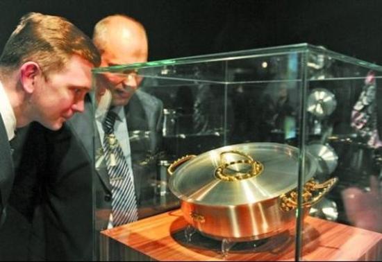 这口不锈钢锅的把手由 18k 黄金打造,并镶嵌有 270 个 13 克拉的钻石,价值 42 万美元。我觉得这里面做的菜下的调料一定要是美元才够档次。